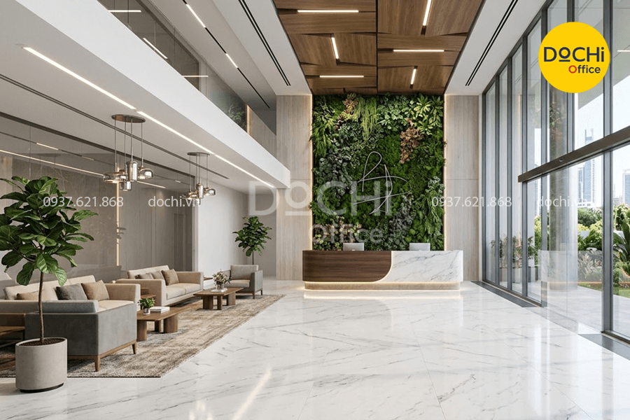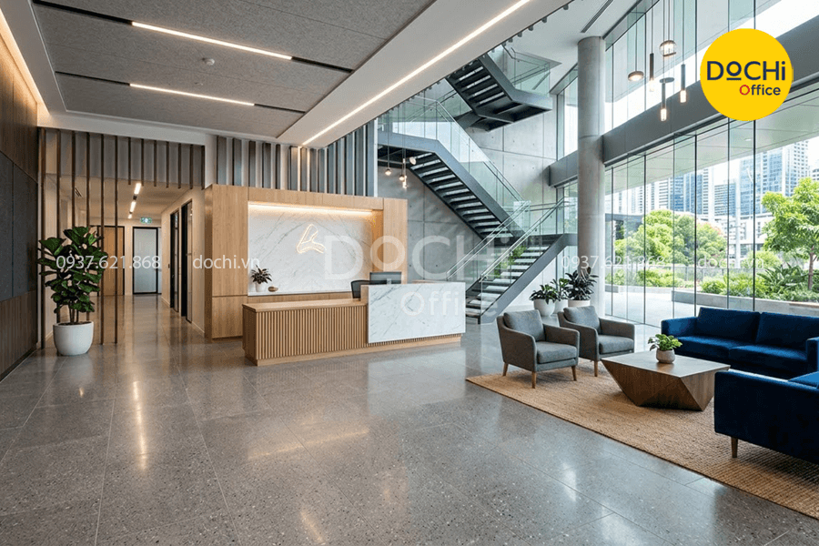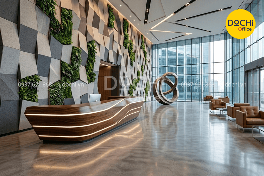 Sảnh đón tiếp là khu vực thể hiện rất rõ tinh thần thương hiệu, gu thẩm mỹ và mức độ đầu tư của doanh nghiệp vào hình ảnh không gian làm việc.