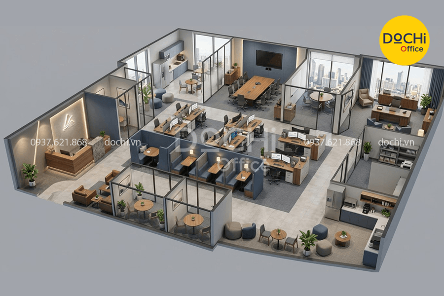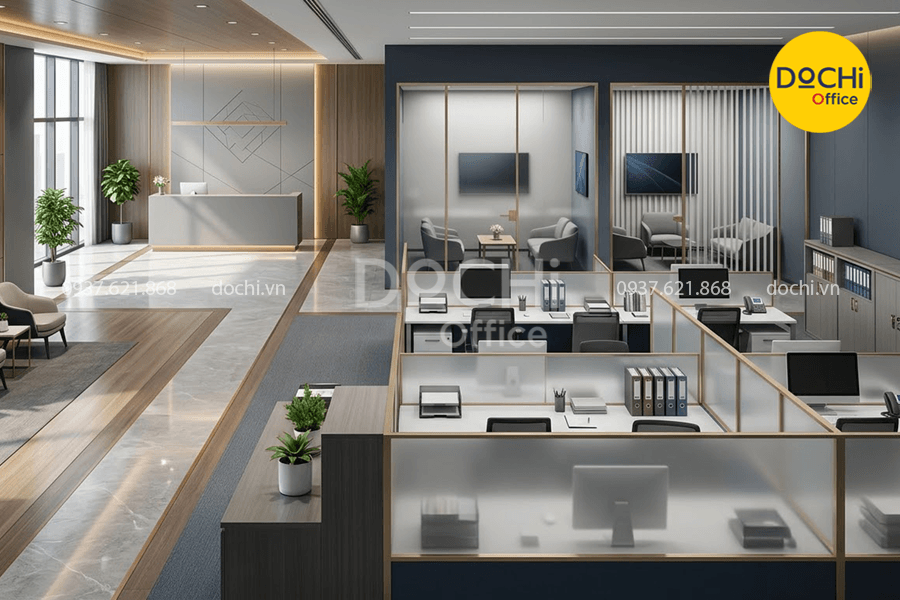 - Nhân sự vẫn làm việc trong cùng một tổng thể, nhưng từng cụm chức năng được phân định bằng kính, tủ thấp hoặc hệ vách nhẹ.