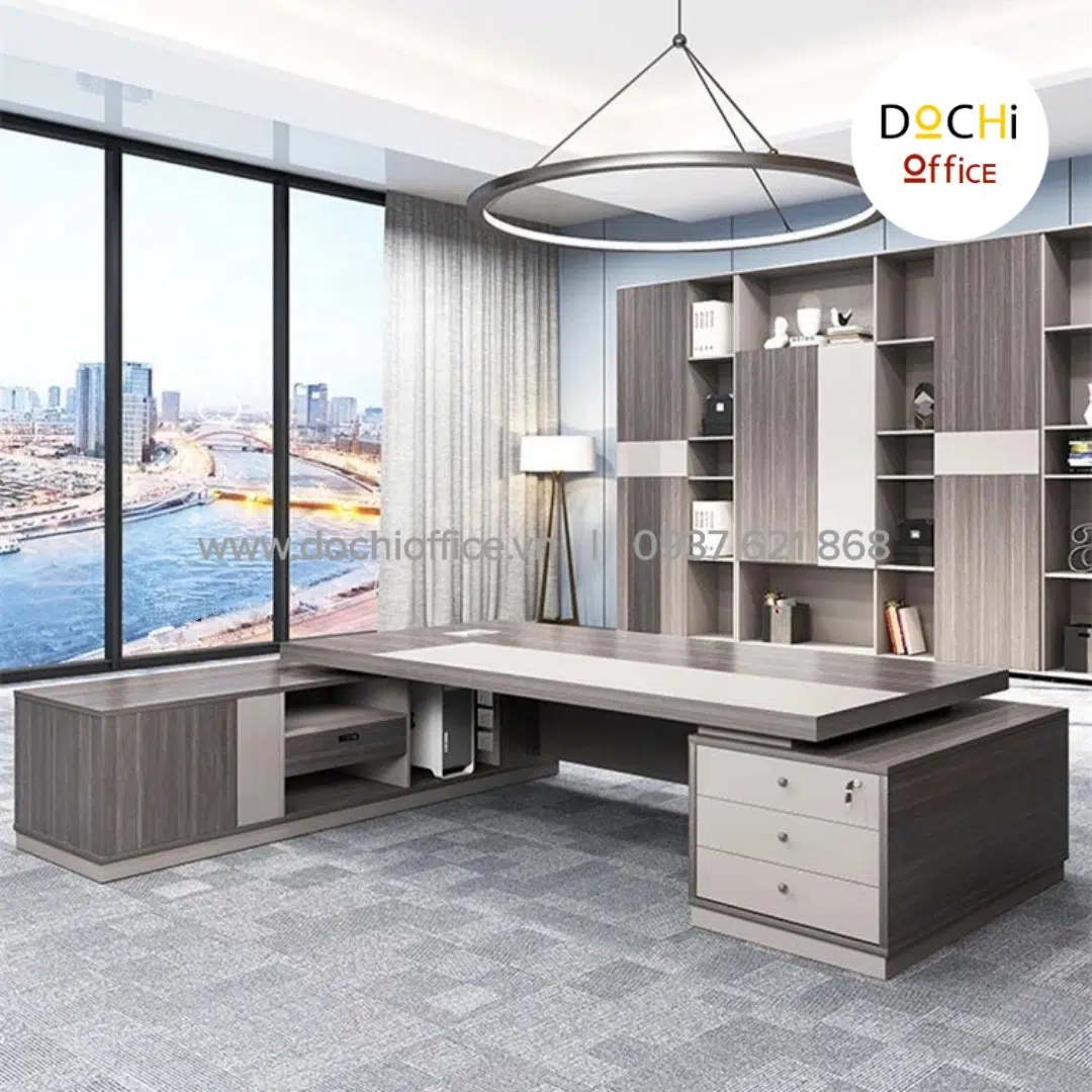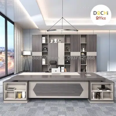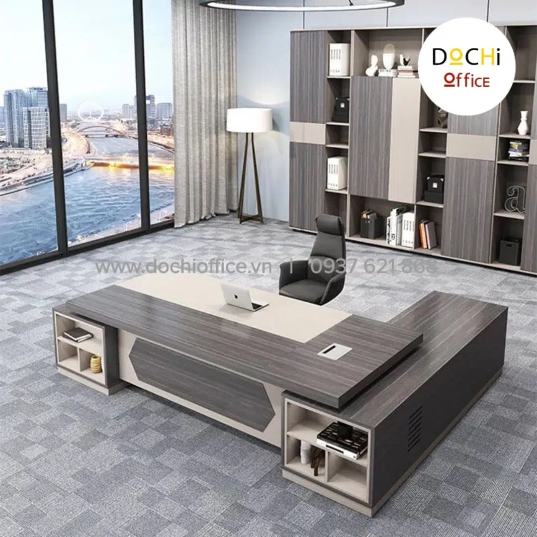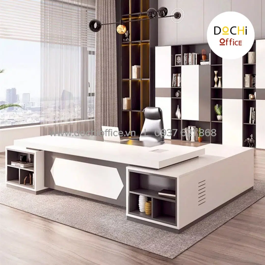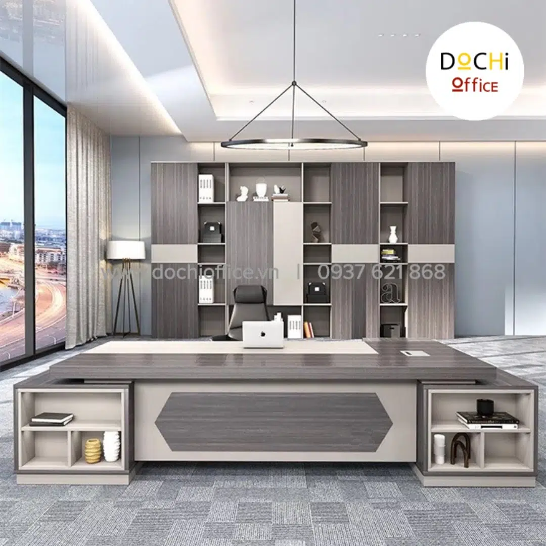 Bàn Giám Đốc Cao Cấp DT033 nhà DOCHI OFFICE với thiết kế sang trọng, đẹp mắt, trực diện là ván bao phủ kín đáo ở 2 bên có khung kệ có thể trang trí bằng sách hoặc bình ly trà hoa văn đẹp mắt, tăng độ thẩm mỹ cho chiếc bàn của bạn.Có 2 tủ nhỏ 2 bên để định hình chiếc bàn luôn vững chắc và tăng thêm phần uy lực. Nếu bạn đang quan tâm đến một chiếc bàn làm việc cho giám đốc đơn giản, thoải mái khi làm việc thì chiếc bàn này là dành cho bạn.