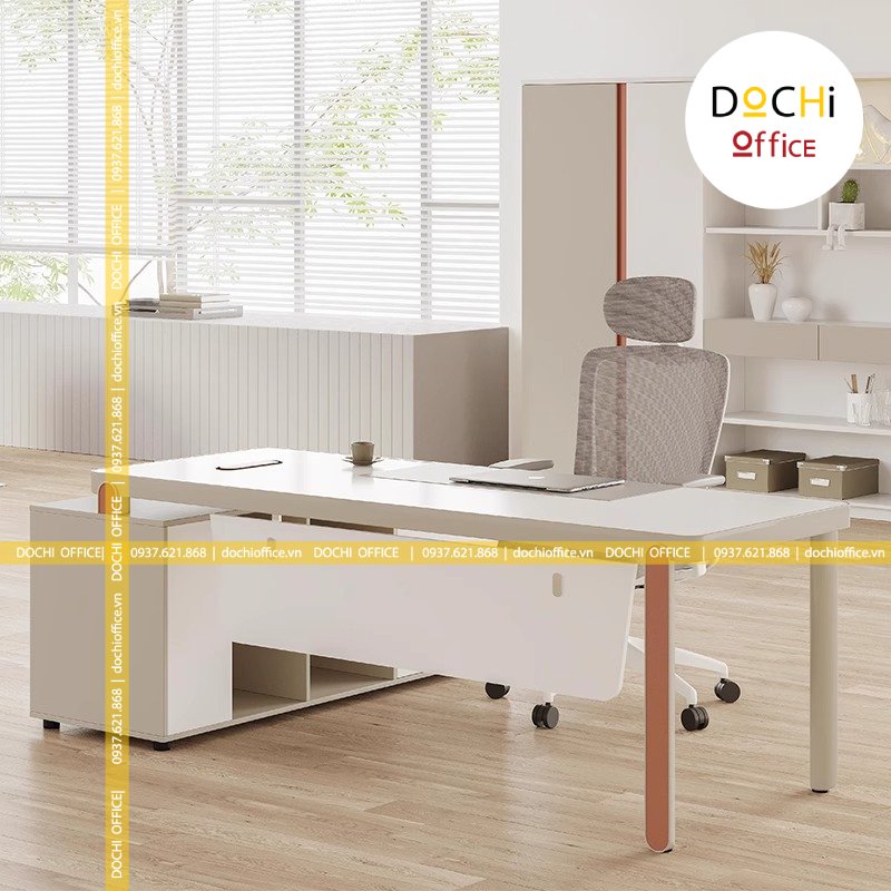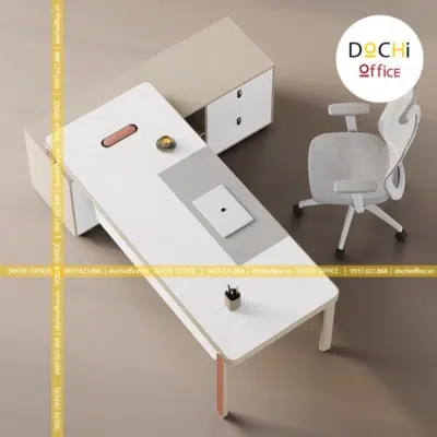 - Kiểu dáng hiện đại: bàn làm việc nhỏ gọn kèm tủ hồ sơ bên cạnh tạo thành góc L bắt mắt, tạo sự tiện lợi và đáp ứng đủ nhu cầu của bàn làm việc giám đốc giúp việc kiểm soát quản lý giấy tờ, hồ sơ, sổ sách dễ dàng hơn. Đây là mẫu bàn làm việc lãnh đạo tạo cảm giác thoải mái, đẹp mắt cho nơi làm việc của bạn.