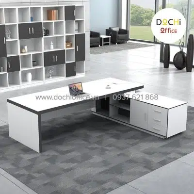 - Kiểu dáng hiện đại: bàn làm việc nhỏ gọn kèm tủ hồ sơ bên cạnh, tạo sự tiện lợi và đáp ứng đủ nhu cầu của bàn làm việc giám đốc giúp việc kiểm soát quản lý giấy tờ, hồ sơ, khi cần thiết chỉ mở ra sử dụng mà không cần đi lại tủ hồ sơ lớn để lấy. Đây là mẫu bàn làm việc lãnh đạo tạo cảm giác thoải mái đẹp mắt cho nơi làm việc.