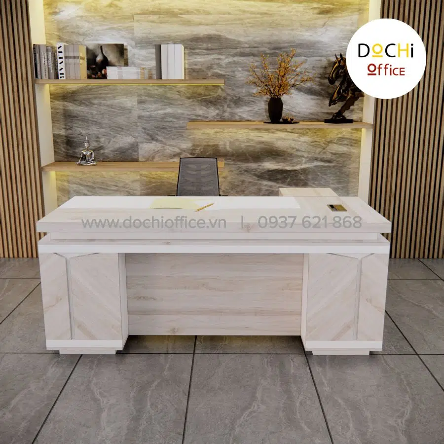 Bàn Giám Đốc Hiện Đại DT069 nhà DOCHI OFFICE với phong cách thiết kế mới lạ khi có sự kết hợp giữa hai tone màu sồi và kem. Phần mặt tiền sử dụng các vân gỗ tạo vách trang trí phía trước sang trọng và vô cùng độc đáo. Điểm đặc biệt của mẫu thiết kế này là mặt bàn dày 50mm tạo nên sự ổn định và chắc chắn khi sử dụng và thêm phần len trang trí làm điểm nhấn. Nếu ai quan tâm đến sự sang trọng, lịch lãm và hãnh diện với khách hàng/ đối tác ghé thăm mang lại hiệu quả, thuận lợi trong công việc sở hữu chiếc bàn này là lựa chọn sáng suốt.