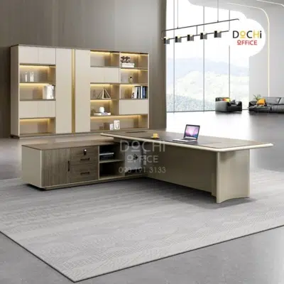 - Kiểu dáng hiện đại: bàn làm việc lãnh đạo kèm tủ hồ sơ bên cạnh tạo thành góc L bắt mắt góp phần tiện lợi và đáp ứng đủ nhu cầu của bàn lãnh đạo, giúp việc kiểm soát quản lý giấy tờ,hồ sơ khi cần thiết chỉ mở ra sử dụng mà không cần đi lại vị trí khác để lấy. Điểm nhấn là phần led chạy hiện đại tạo dấu ấn thu hút.