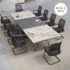 - Kiểu dáng hiện đại: Mặt bàn được kết hợp giữa 2 mảnh ghép, mỗi mảnh ghép đều được hoàn thiện và trang bị đủ tiện nghi cho chiếc bàn họp ván MDF sơn PU đi từ mặt bàn đến khung chân. Không những mang tính thẩm mỹ mà còn chắc chắn, bền bỉ thương được những doanh nghiệp/ công ty lớn hay sử dụng. Đây là mẫu bàn dành cho khoảng 14 người mà doanh nghiệp yêu thích sự sang trọng nên lựa chọn.