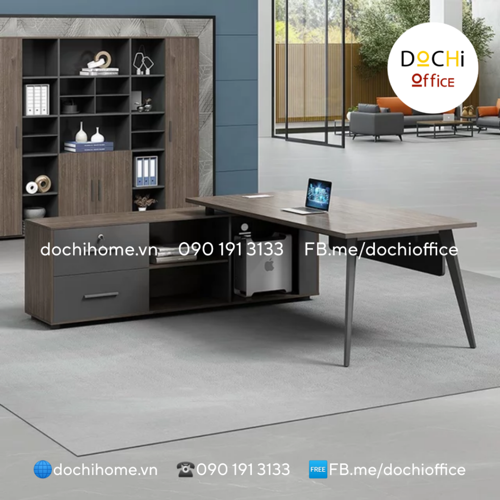 Bàn Làm Việc Giám Đốc DT016 sang trọng hình chữ L nhà DOCHI OFFICE với phong cách hiện đại khi có sự kết hợp giữa tủ gỗ và chân cone thép sơn tĩnh điện. Nếu ai quan tâm đến sự sang trọng, lịch lãm và nở mặt với khách hàng/ đối tác ghé thăm mang lại hiệu quả, thuận lợi trong công việc sở hữu chiếc bàn này là lựa chọn sáng suốt.