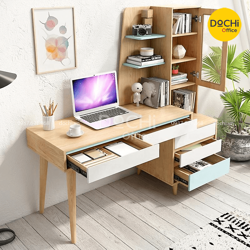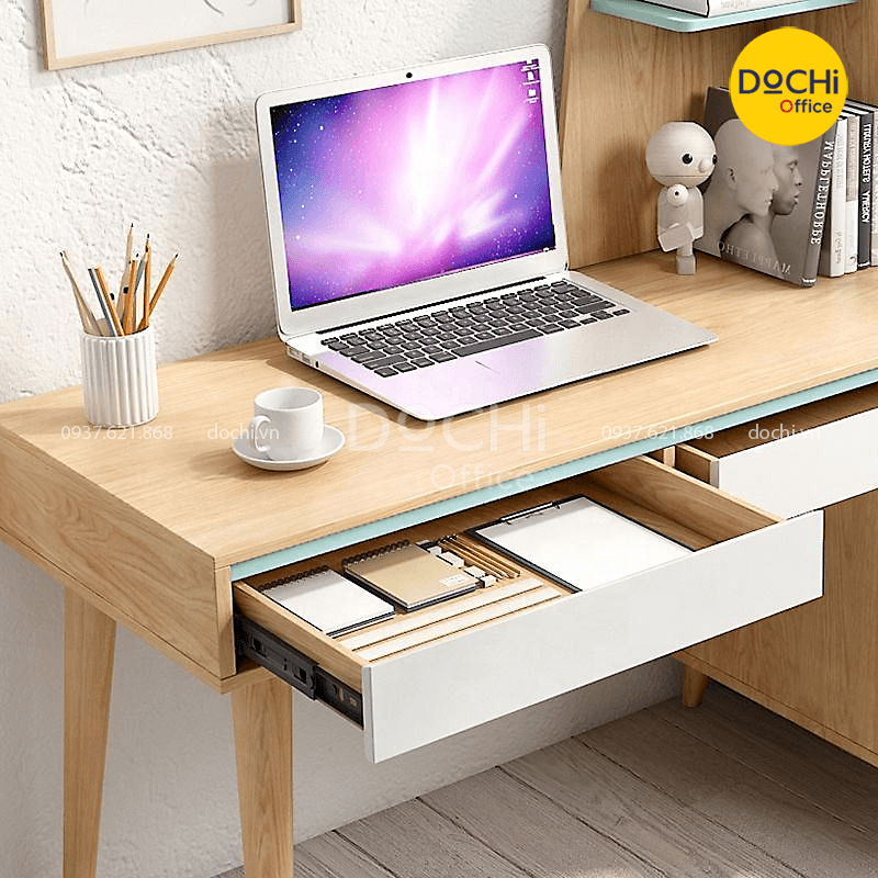 - Mặt bàn rộng vừa đủ để đặt máy tính, tài liệu, vật dụng cá nhân. Một số mẫu còn tích hợp hộc tủ hoặc ngăn kéo nhỏ, giúp lưu trữ gọn gàng, tạo không gian làm việc khoa học.