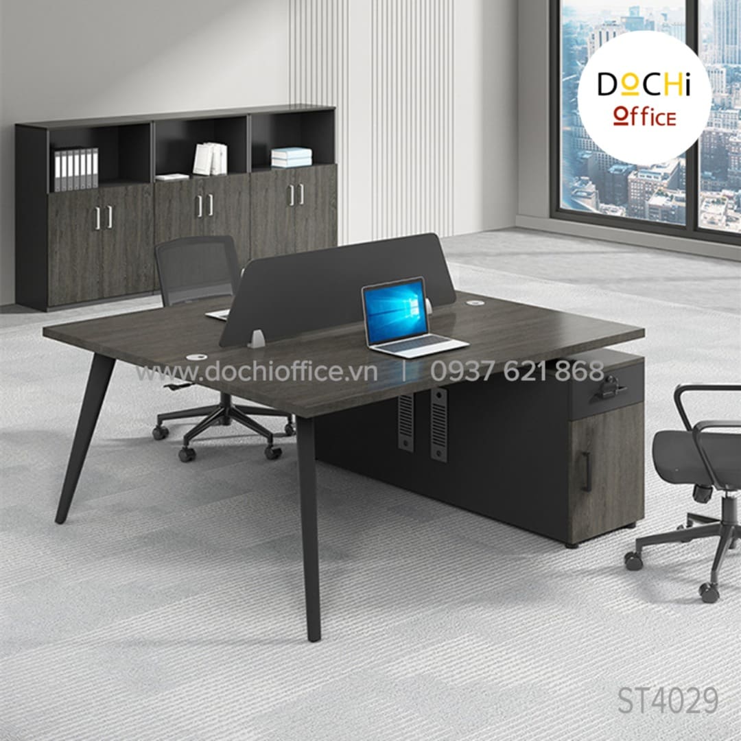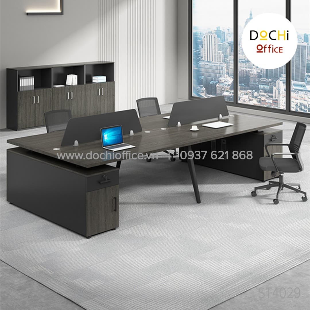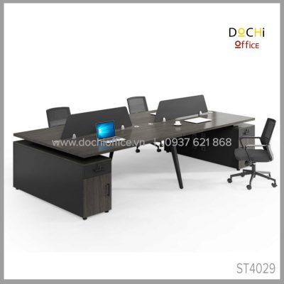 Cụm Bàn Làm Việc Nhóm ST4029 – Cụm 3 nhà DOCHI OFFICE với thiết kế 2 bên chân thép bắt chéo giữa là tủ từ gỗ MDF làm trụ là sự kết hợp giữa cổ điển và hiện đại tối ưu hóa công năng tạo cho người sử dụng cảm giác thoải mái.