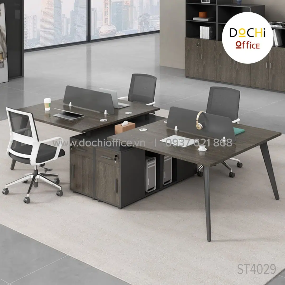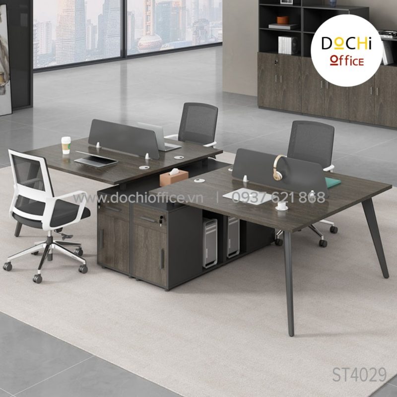 Cụm Bàn Làm Việc Nhóm ST4029 – Cụm 3 nhà DOCHI OFFICE với thiết kế 2 bên chân thép bắt chéo giữa là tủ từ gỗ MDF làm trụ là sự kết hợp giữa cổ điển và hiện đại tối ưu hóa công năng tạo cho người sử dụng cảm giác thoải mái.