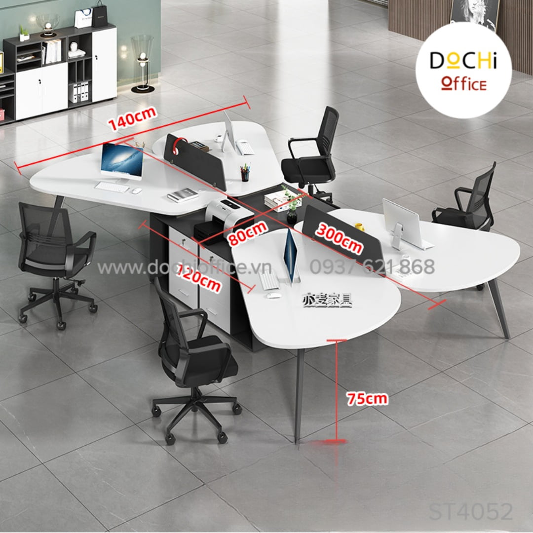 Dưới đây là thông tin chi tiết sản phẩm Cụm Bàn Làm Việc 4 Người ST4052 chuẩn. Ngoài ra DOCHI OFFICE còn nhận thiết kế, sản xuất theo kích thước và màu sắc yêu cầu.