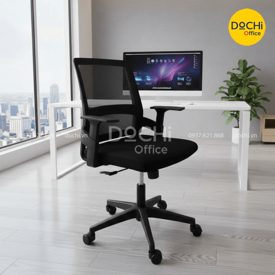 Màu đen trung tính giúp ghế luôn sạch sẽ và giữ được vẻ chuyên nghiệp theo thời gian. Đây là lựa chọn tối ưu cho doanh nghiệp đang tìm kiếm mẫu ghế xoay nhân viên chất lượng, bền, thoáng và đáp ứng tiêu chuẩn công thái học cơ bản cho môi trường làm việc liên tục.
