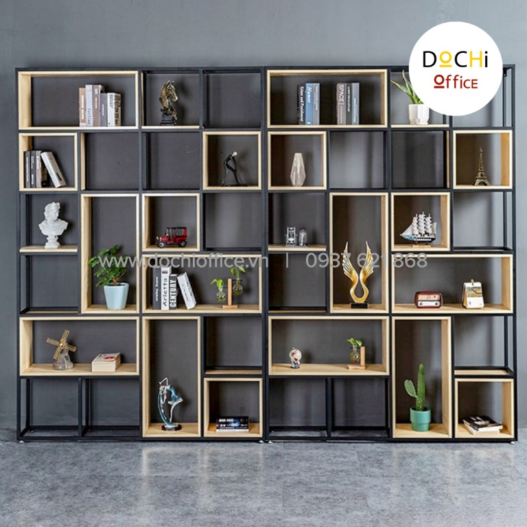 Kệ trang trí văn phòng kết hợp giữa khung thép và ngăn gỗ OKTT016:
