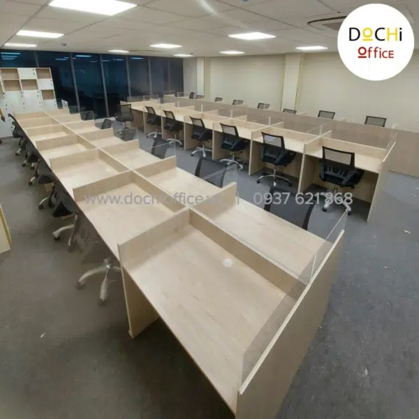Hạng mục: Nội thất văn phòng công ty với các hạng mục: Bàn quản lý, Bàn cụm 4 nhân viên, Bàn cụm 10 nhân viên, Bàn cụm 6 nhân viên, Bàn đơn, Bàn họp.