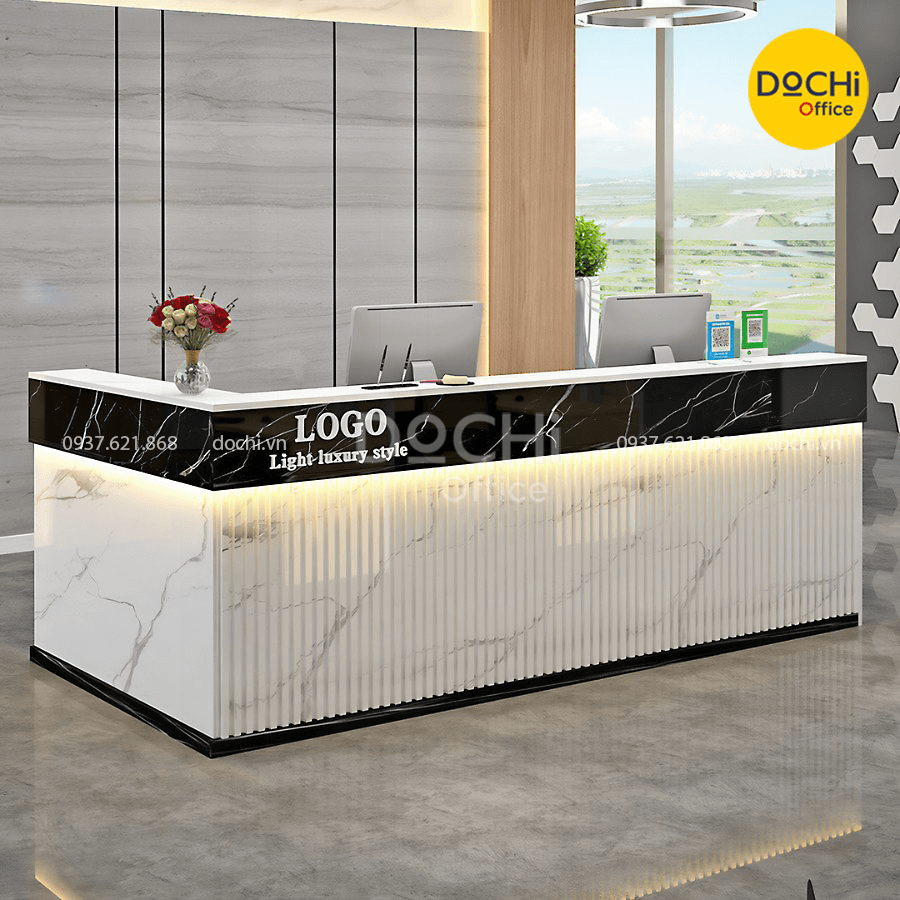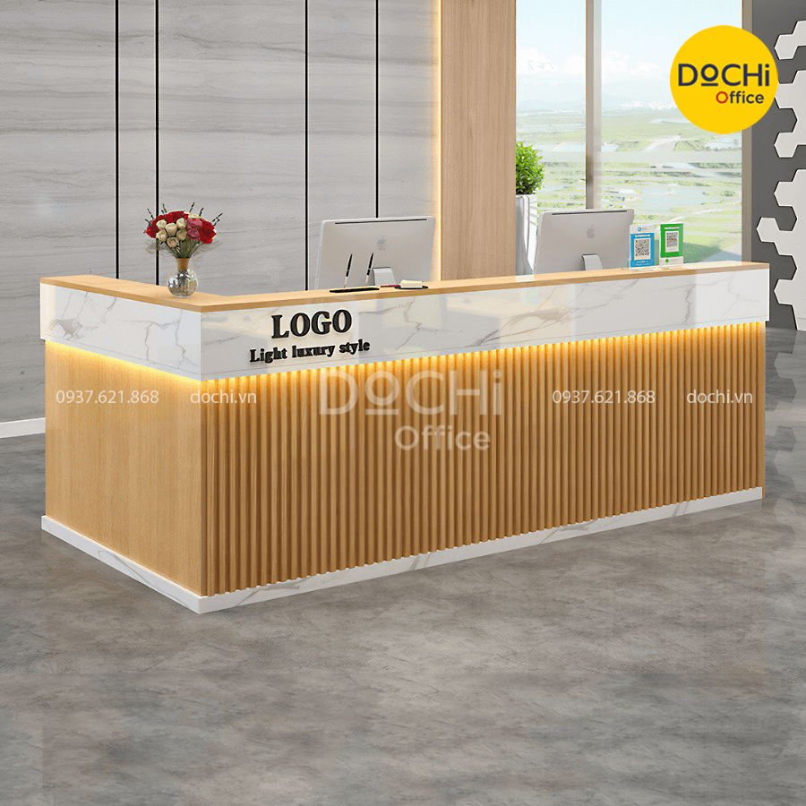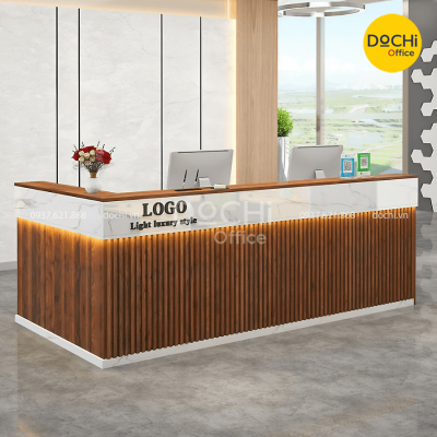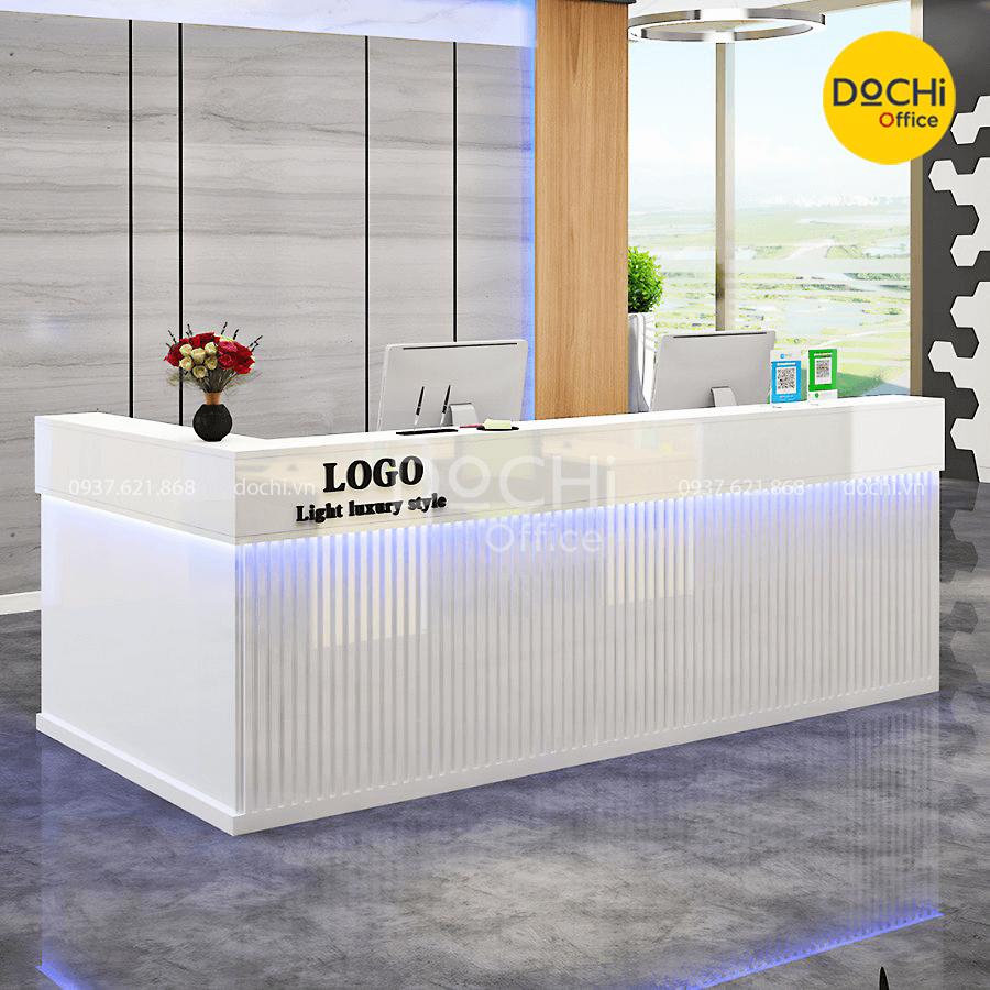 Quầy Tiếp Tân Sang Trọng QLT016 nhà DOCHI OFFICE là mẫu thiết kế chữ L hiện đại với điểm nhấn nhờ bề mặt được chạy rãnh cách điệu. Kết hợp hệ led tạo điểm nhấn ấn tượng tô điểm cho quầy tiếp tân nổi bật. Chiếc quầy đóng vai trò quan trọng khách hàng/ đối tác nhìn vào trực diện bộ mặt của công ty mà đánh giá cửa hàng, công ty mình. Chọn quầy làm việc lễ tân hợp không gian, hợp thời sẽ để lại ấn tượng sâu sắc trong lòng họ. Đây là quầy dành cho lễ tân làm việc đẹp, chất lượng, thẩm mỹ mà các doanh nghiệp/ công ty nên lựa chọn.