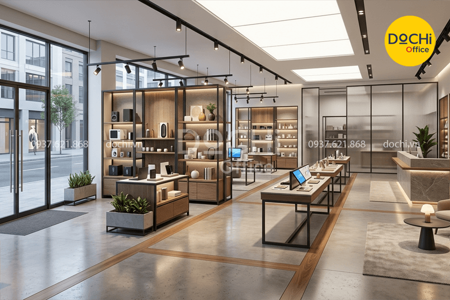- Ngoài khu vực trưng bày, doanh nghiệp còn cần quầy thu ngân, khu tư vấn, kho nhỏ lưu hàng, không gian thao tác cho nhân viên và hệ thống điện dữ liệu ổn định.