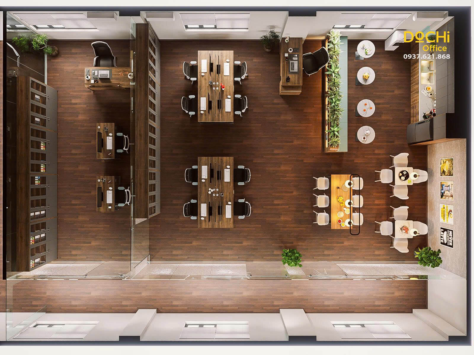 Từ khu vực làm việc đến pantry và phòng giám đốc đều được DOCHI thiết kế đồng bộ, thể hiện sự liền mạch, mang lại trải nghiệm thị giác hài hòa và chuyên