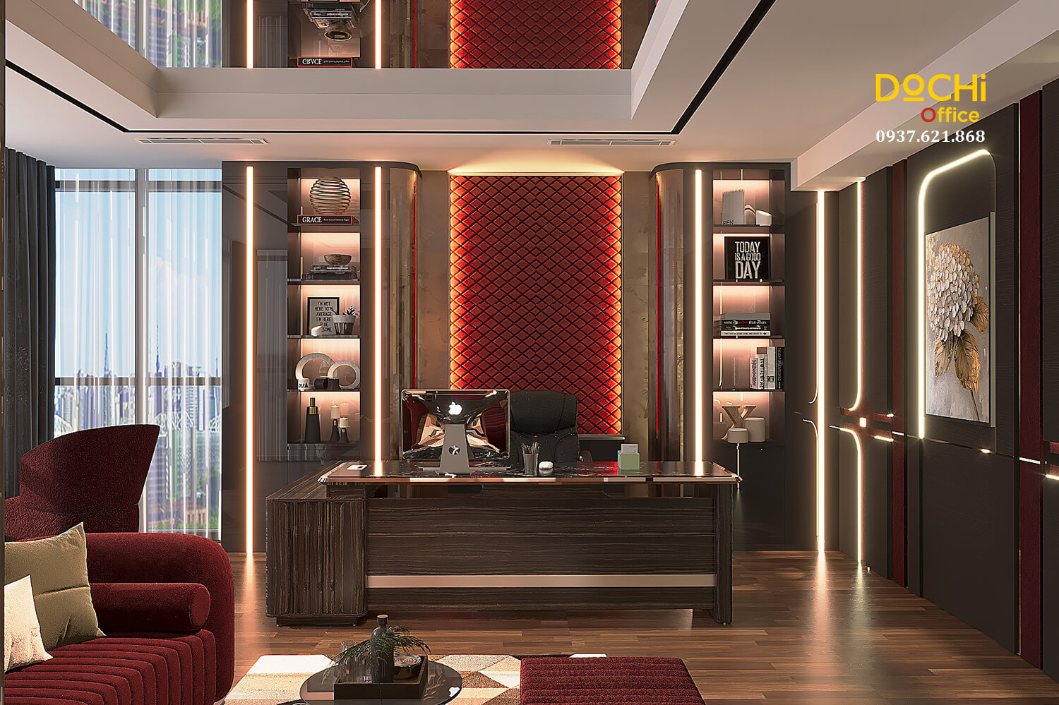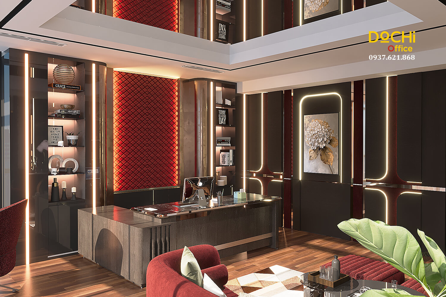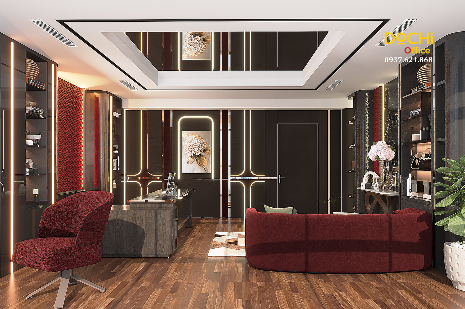 Văn phòng giám đốc LG được định hình theo phong cách luxury hiện đại, kết hợp gam đỏ rượu vang và ánh sáng vàng LED để tạo ra không gian quyền lực nhưng vẫn tinh tế.- Màu sắc chủ đạo mang lại cảm giác ấm, độ sâu và sự khác biệt rõ rệt so với các mẫu văn phòng thông thường.