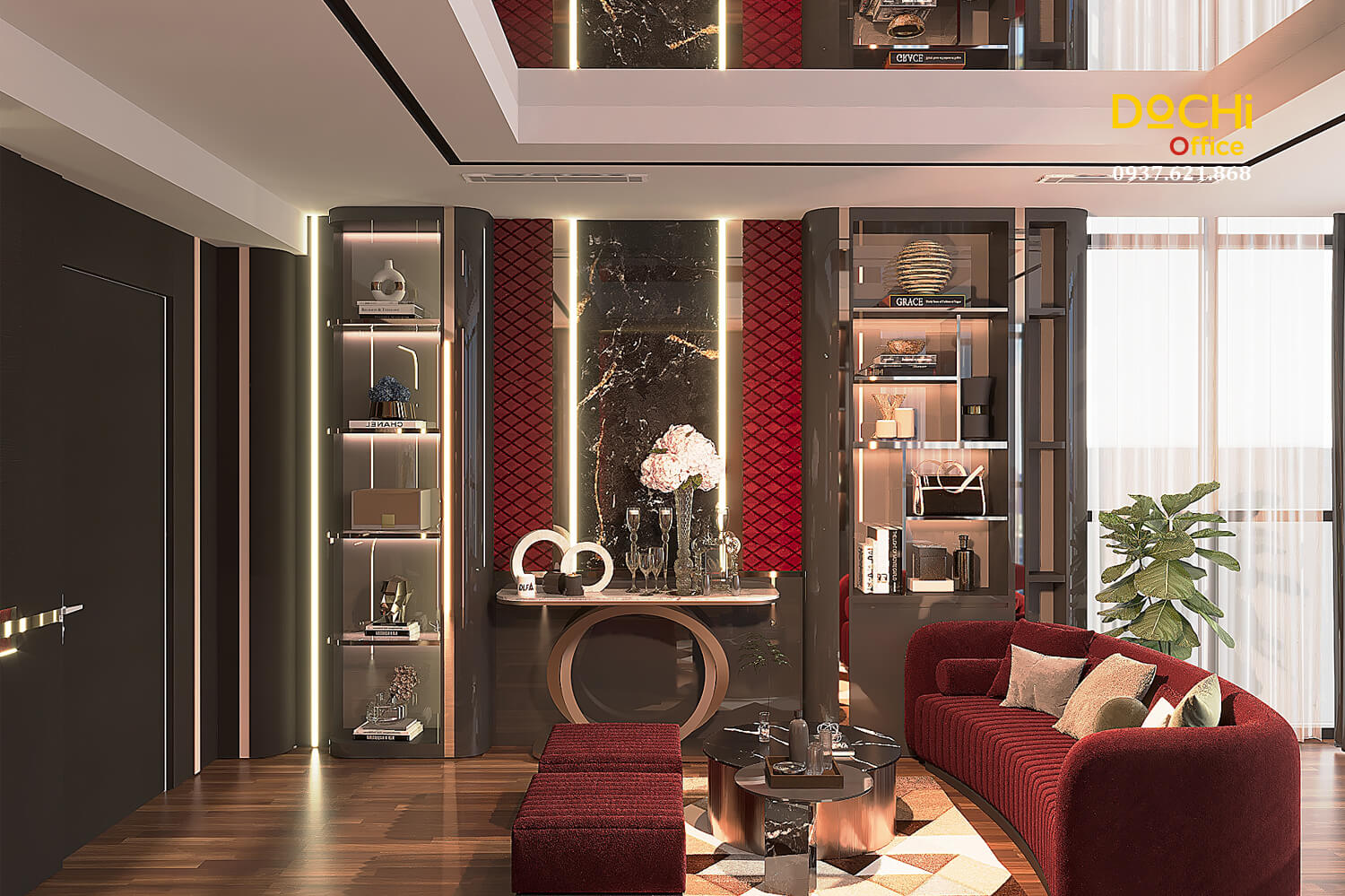 - Hạng mục: Bàn giám đốc,Ghế giám đốc, Ghế tiếp khách đơn, Sofa cong màu đỏ rượu, Ghế đôn tiếp khách, Bàn trà đôi mặt đá, Bàn console trang trí, Hệ tủ trưng bày bo cong, Kệ trang trí âm tường,…