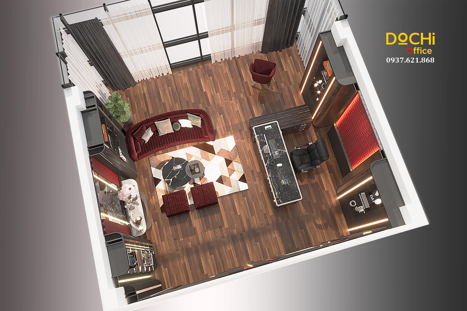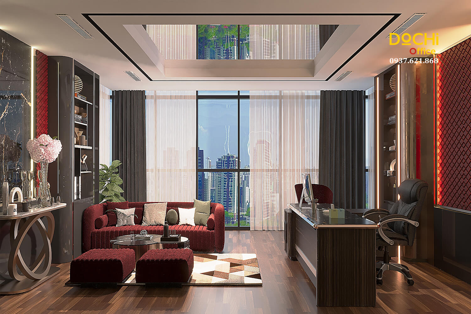 - Sofa cong tạo hình mềm mại nhưng lại mang sắc đỏ quyền lực, kết hợp thảm họa tiết và bàn trà mặt đá giúp khu vực tiếp khách trở nên sang trọng. Thiết kế này giúp giám đốc dễ dàng tiếp khách, trao đổi các cuộc họp nhanh hoặc tạo cảm giác thoải mái trước các cuộc thương thảo quan trọng.