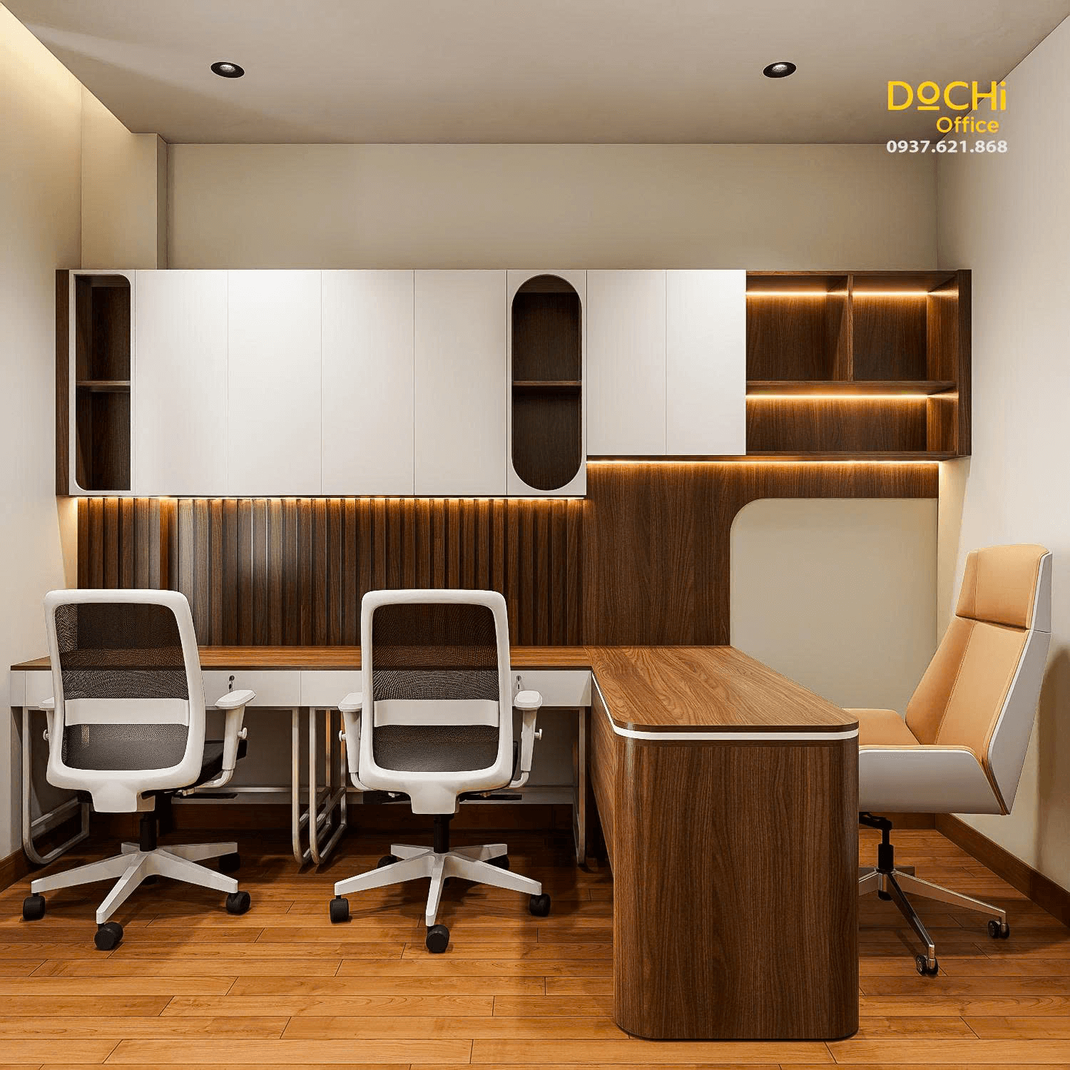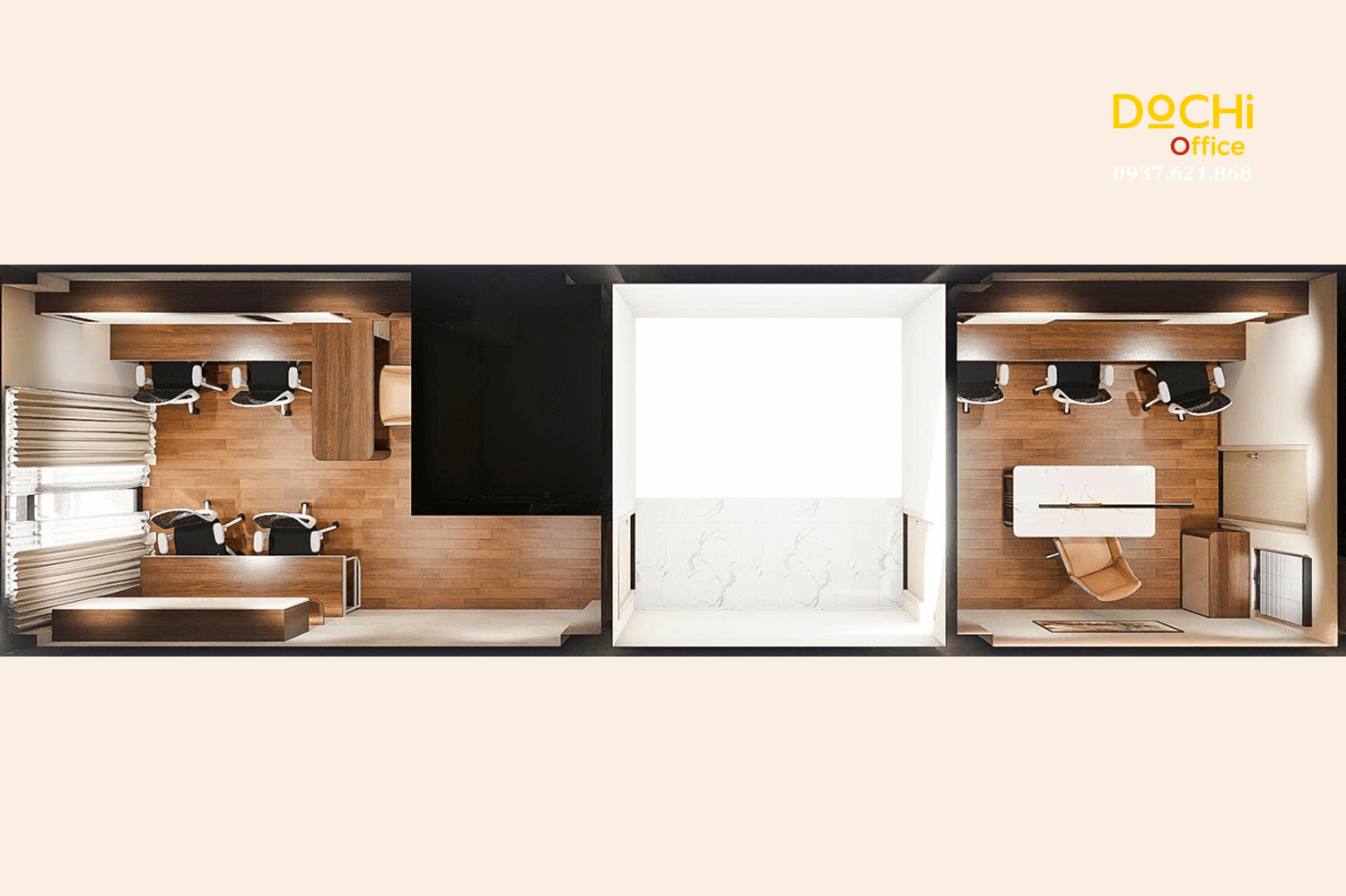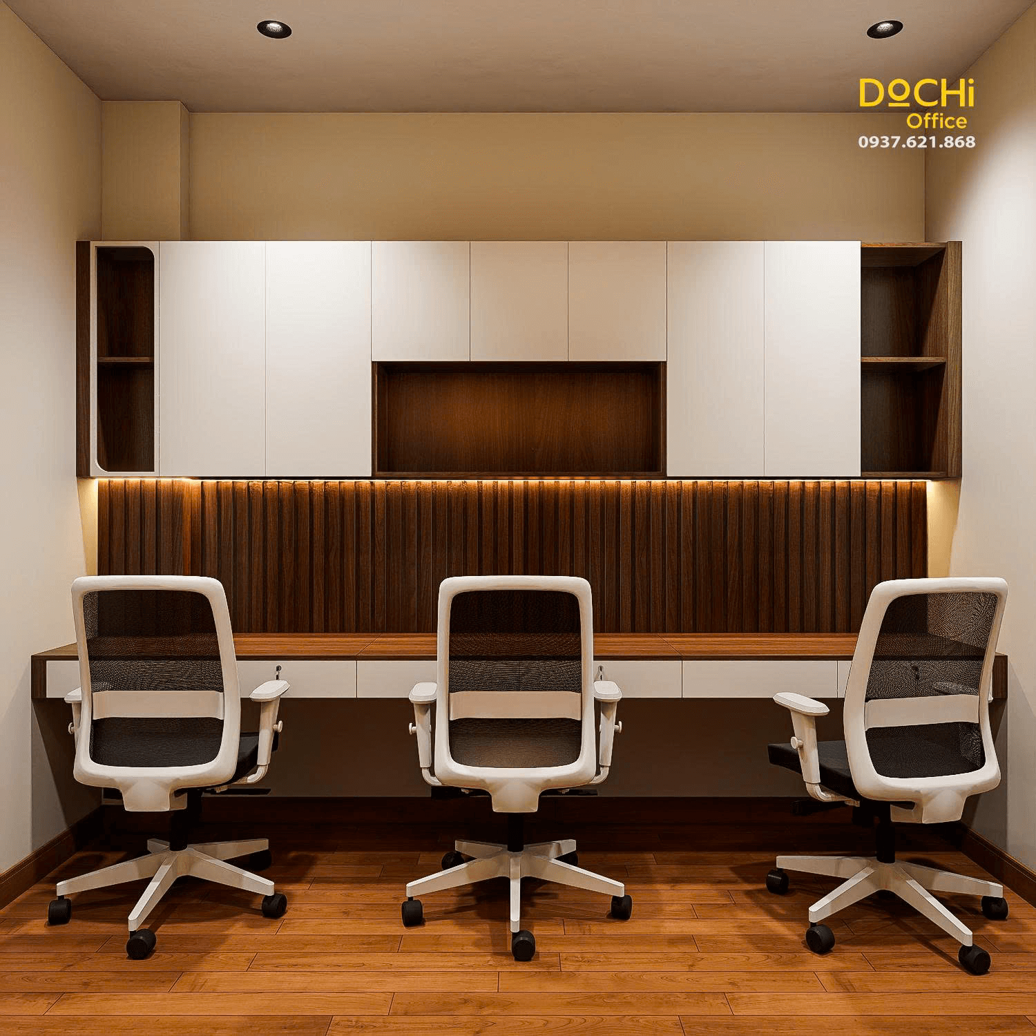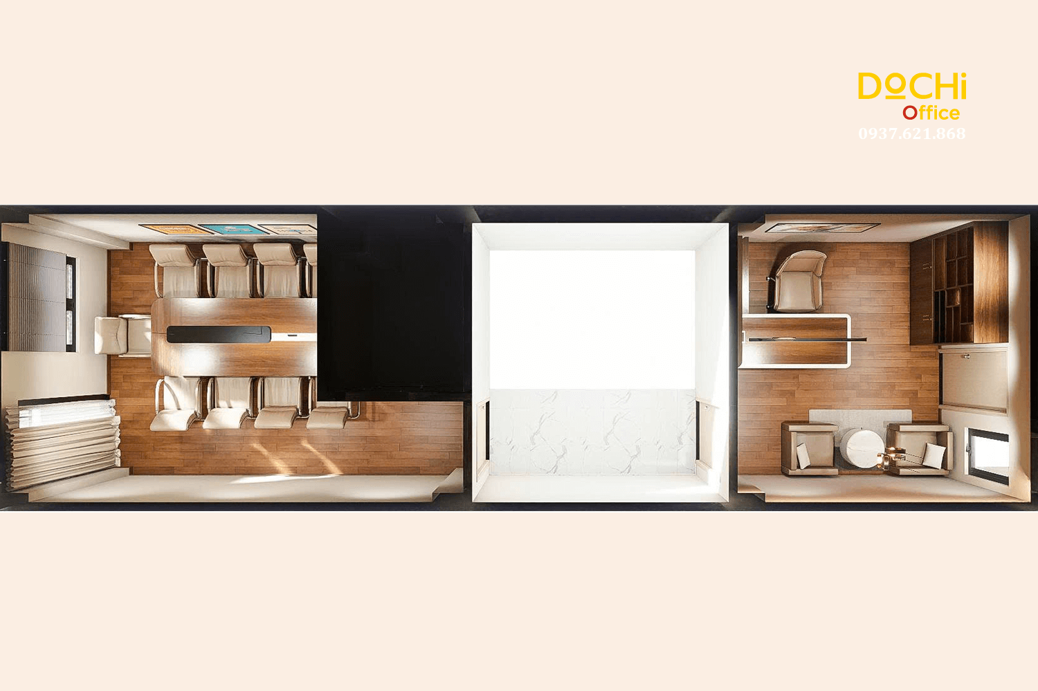 - Đội ngũ chuyên nghiệp: DOCHI OFFICE mang đến những thiết kế đồng bộ từ quầy lễ tân, khu làm việc, phòng họp đến phòng giám đốc.