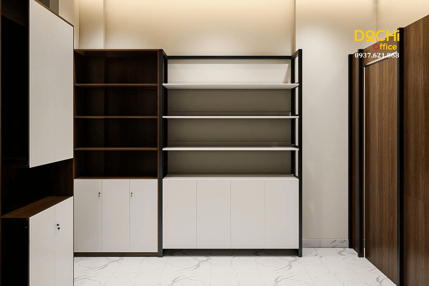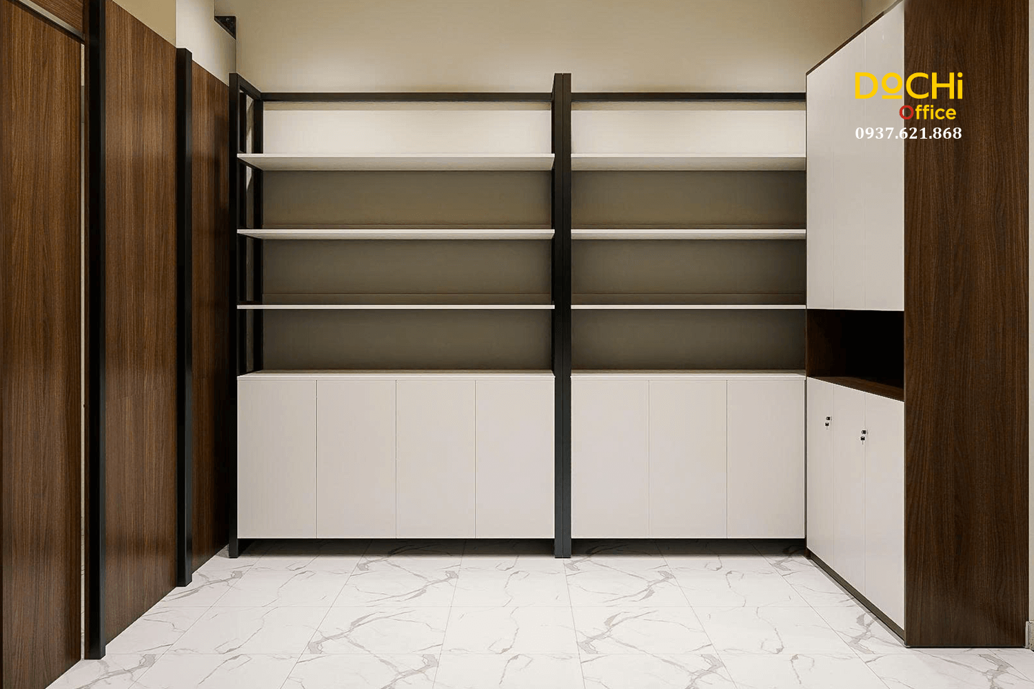 - Thiết kế kệ mở cho phép trưng bày tài liệu, vật phẩm thương hiệu hoặc hộp tài liệu, giúp văn phòng có điểm nhìn đẹp mắt mà vẫn mang tính thực tiễn.