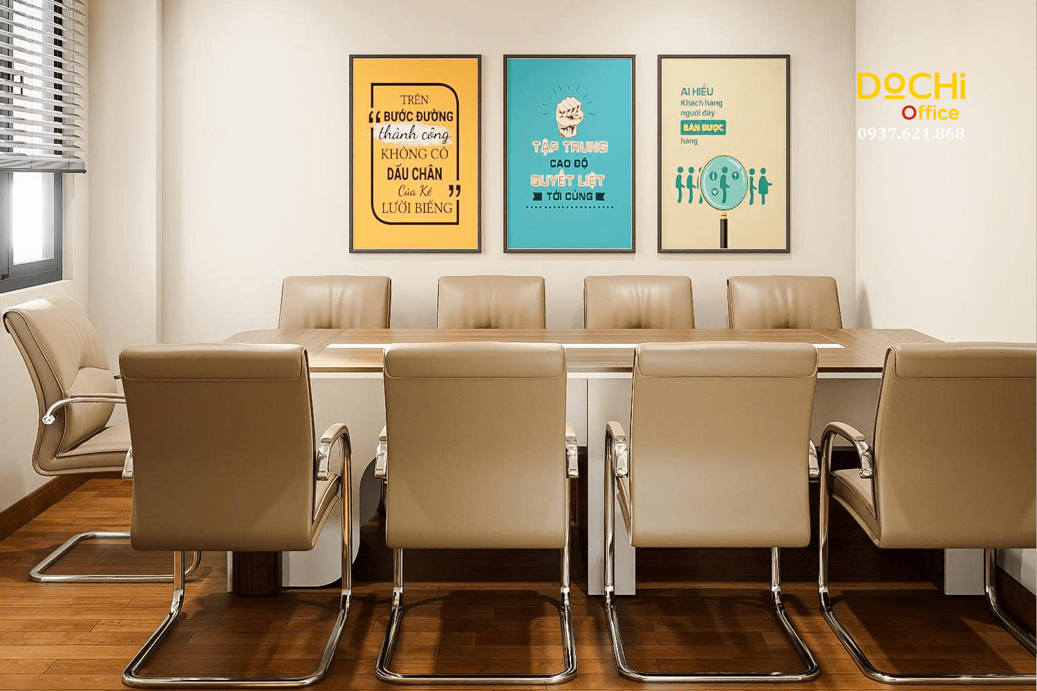 - Tổng thể phòng họp được tối ưu để phục vụ các cuộc trao đổi nhóm, họp nội bộ hoặc đón tiếp đối tác quan trọng, nơi sự chỉn chu và đồng bộ hình ảnh nội thất góp phần nâng cao uy tín doanh nghiệp.