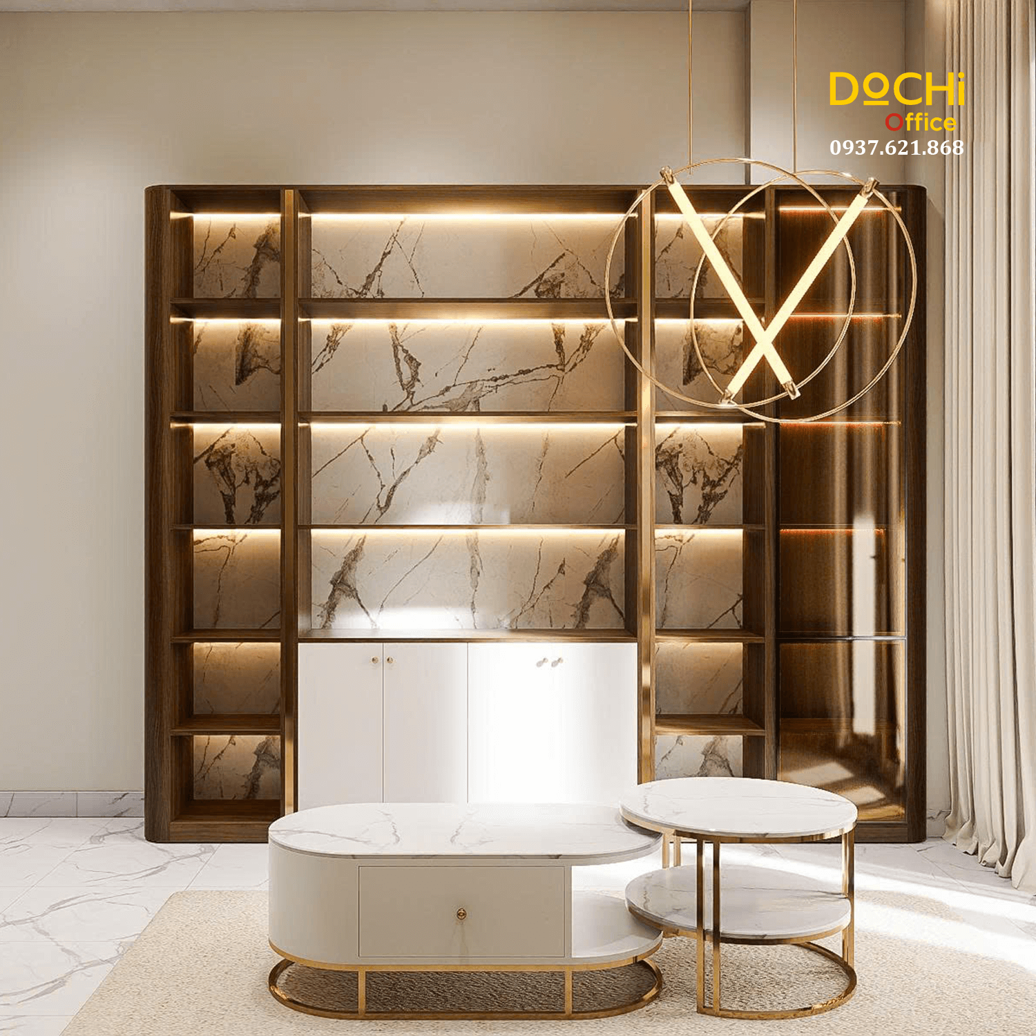 - Bàn trà gồm hai mẫu kết hợp: một bàn tròn và một bàn oval. Mặt đá trắng vân nhẹ, chân bàn mạ vàng tạo hiệu ứng sang trọng mà không gây nặng nề. Thiết kế bo cong hạn chế va chạm, phù hợp văn phòng diện tích hẹp.