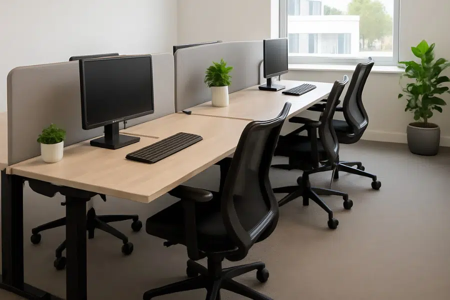 - Không gian làm việc có thể bố trí bàn cụm nhân viên module dạng dài cho nhóm nhân sự, phân khu bằng vách kính mỏng hoặc lam gỗ nhẹ để tạo sự thông thoáng.